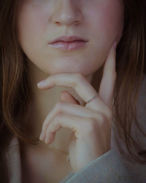 La bague Arc en Ciel pierres précieuses et pierres fines, une alliance en or recyclé 18 carats ornée de 18 pierres multicolores. Cette bague unique est composée de saphirs et de pierres fines aux nuances vibrantes, créant un dégradé de couleurs captivantes : saphir bleu, topaze bleue, tourmaline rose, améthyste violette, tsavorite verte. Chaque pierre précieuse est minutieusement sertie pour garantir un éclat et une durabilité exceptionnels, faisant de cette bague un bijou remarquable à porter au quotidien ou lors d’occasions spéciales. La bague Arc en Ciel reflète l’engagement d’Aupiho Joaillerie pour une joaillerie éthique, en utilisant de l’or recyclé 18 carats et fabriqué en France. Son design moderne et coloré s’accorde parfaitement à d’autres bagues en or ou à des bijoux plus sobres, ajoutant une touche de gaieté à votre style. Cette bague est idéale comme cadeau pour célébrer un anniversaire, un événement spécial, ou pour exprimer votre personnalité unique.
