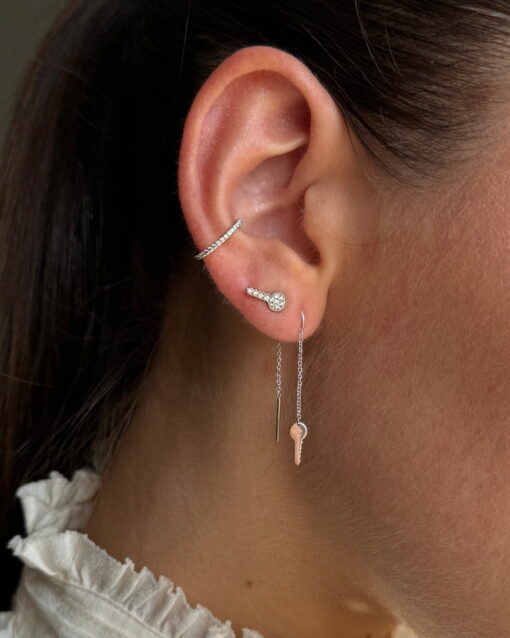 La boucle d’oreille clé diamants Sésame est un bijou emblématique d’Aupiho Joaillerie, elle apporte une touche d’élégance et de douceur. Fabriquée en or 18 carats recyclé, pavée délicatement de 11 diamants blancs étincelants. Disponible en or jaune, or rose et or blanc, elle s’adapte à tous les goûts et à toutes les occasions. Le motif de la clé est plus qu’un simple design c’est un porte bonheur ; il symbolise la chance, l’amour et les nouvelles possibilités. Que vous soyez une femme à la recherche d’un accessoire délicat ou une mère désireuse d’initier votre enfant à la joaillerie, ces boucles d’oreilles clés sont idéales. Leur originalité et leur discrétion font d’elles des indispensables de toute collection de bijoux, permettant de les porter aussi bien au quotidien que lors d’événements spéciaux. Les puces d’oreilles clés en or recyclé 18 carats sont façonnées avec soin, alliant confort et esthétique. Elles se marient facilement avec d’autres bijoux, vous offrant la possibilité de créer des mix and match uniques et personnalisés. Chaque bijou est fabriqué en France, avec un savoir-faire artisanal exceptionnel. Une boucle d’oreille originale et éclatantes sont des indispensables !