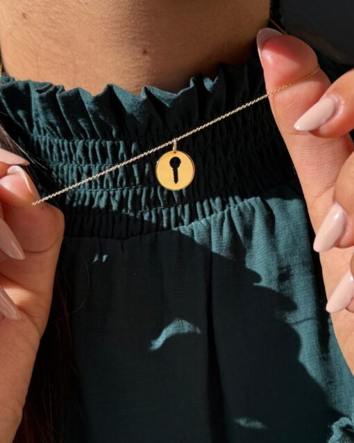 Découvrez le charme du collier médaille clé sésame, une interprétation unique et raffinée du thème de la clé, signature de la marque. Confectionné en or 18 carats recyclé, le collier médaille : un disque d’or poli miroir, délicatement évidé en son centre pour révéler la silhouette d’une clé, comme une serrure…